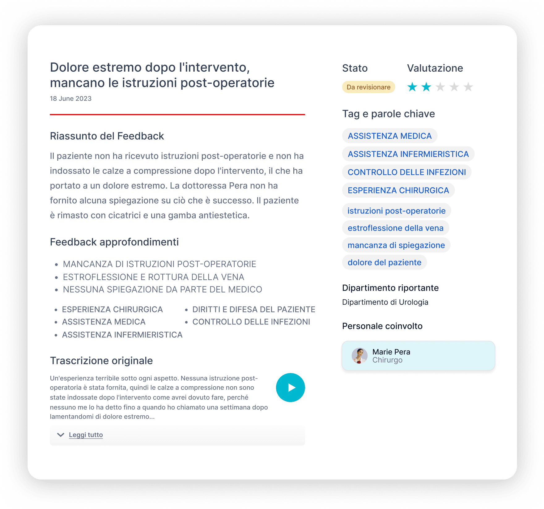 Amidst the often lengthy patient feedback, crucial information can be nestled, our engine processes voice transcriptions to provide a concise summary of pertinent or actionable insights from patient feedback