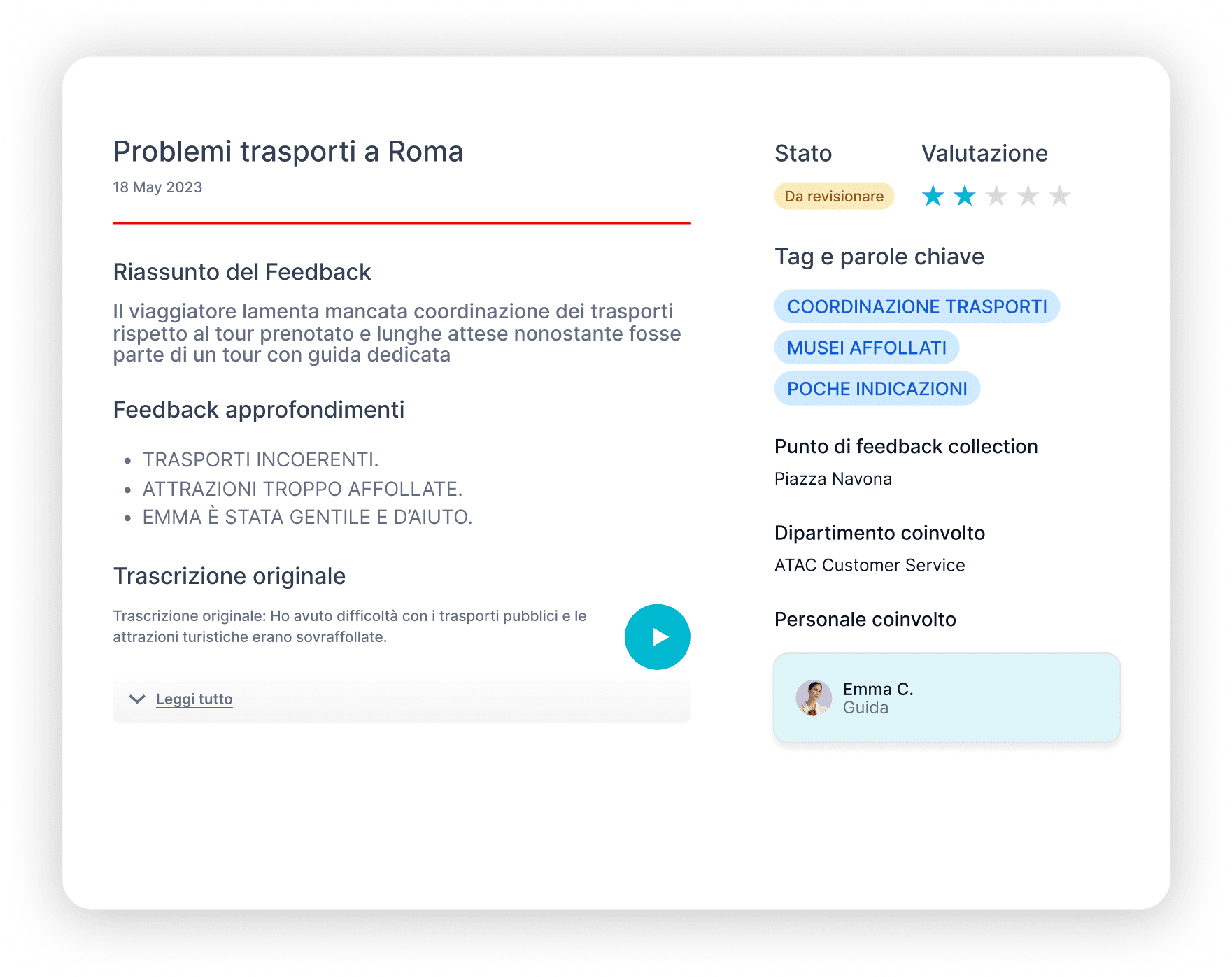 Nel mondo frenetico del turismo, fornire un servizio clienti tempestivo ed efficace è cruciale per mantenere un'elevata soddisfazione dei visitatori. Feedback Companion automatizza aspetti chiave del servizio clienti e delle operazioni degli uffici turistici, consentendo interazioni più fluide ed efficienti con i visitatori.